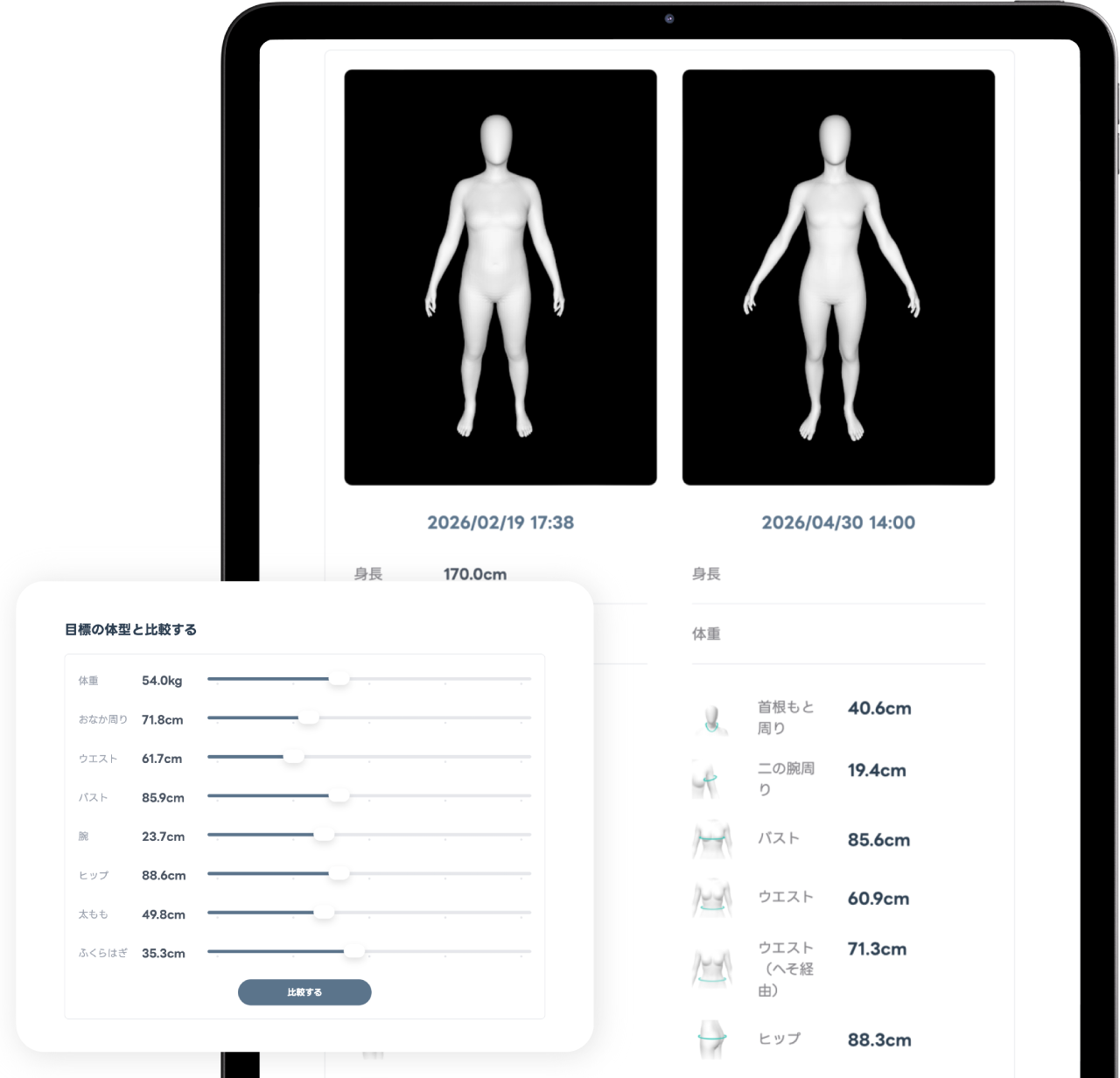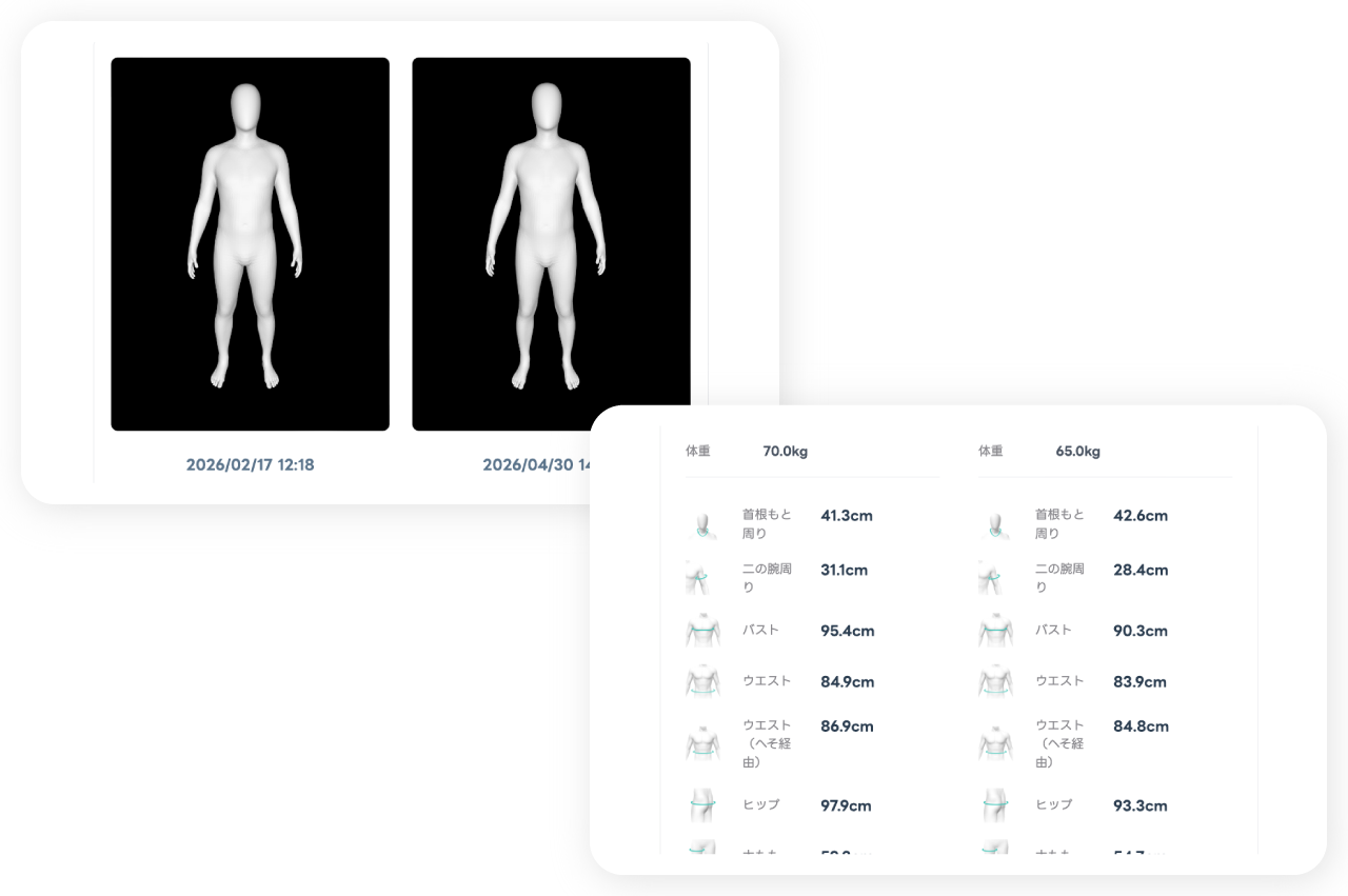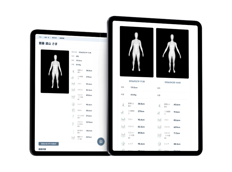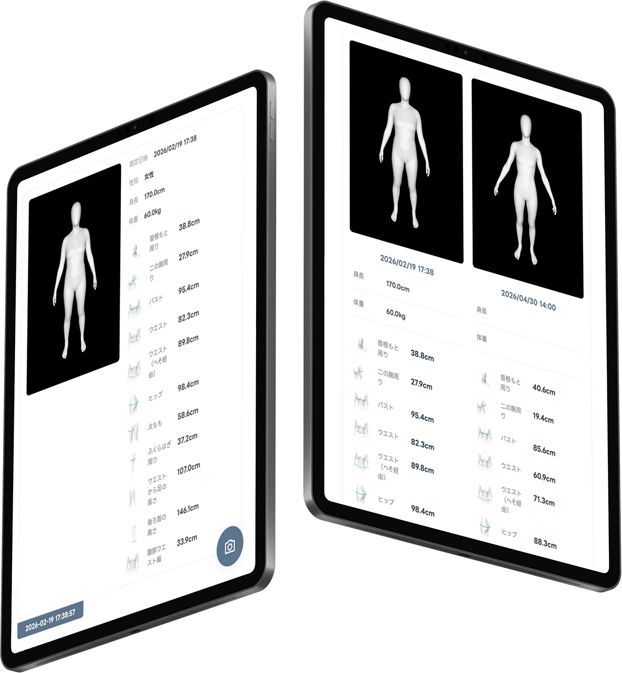 お客様の不安が、確信に変わりますAIが来店ごとに体型を3Dデータで自動記録。「ここまで変わりましたよ」と見せるだけで、お客様の不安が確信に変わり、「もっと続けたい」が自然に生まれます。